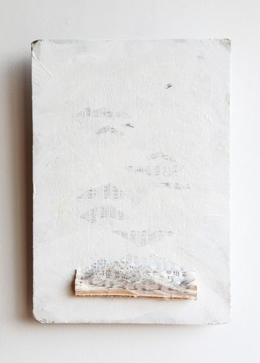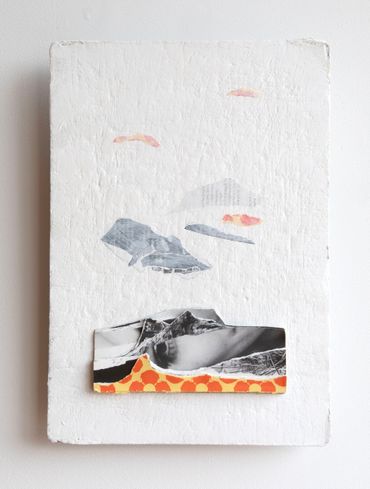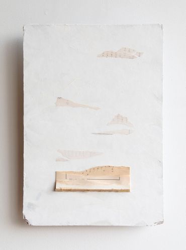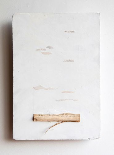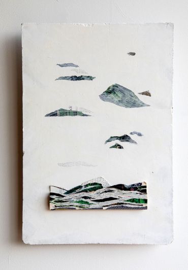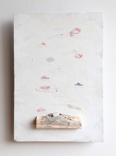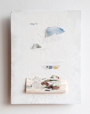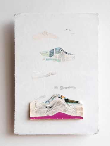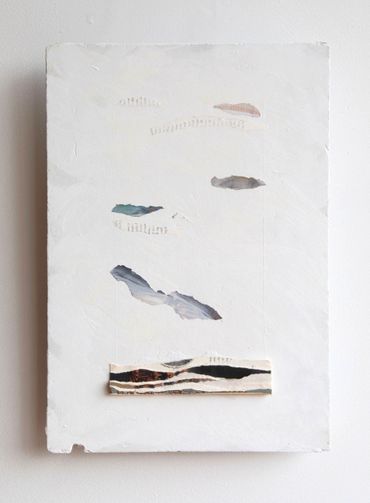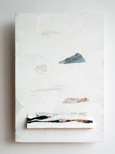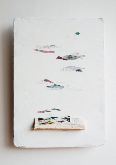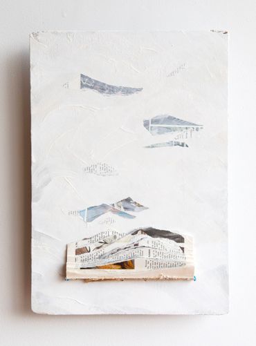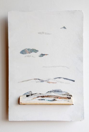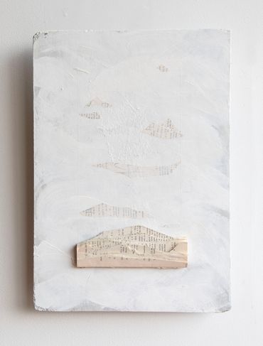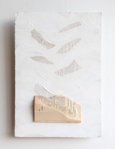 FLOATING WORD The paintings are still life, mixed media interpretations of the installation Word Matter. From a horizontal perspective, the movement of brush strokes and torn paper represents the repetition of organic matter that occur in a multitude of environments. It recalls familiar landscapes of water, hills, clouds in a minimal, flat presentation the three dimensional book is the foundation.